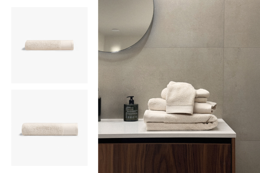 Creemos que la calidad superior y el respeto por el planeta pueden ir de la mano. Así presentamos nuestra última colección detoallas dealgodón orgánico, que incluye sábana de baño, toalla de baño, toalla de mano y toalla de rostro en los elegantes tonos blanco y beige.